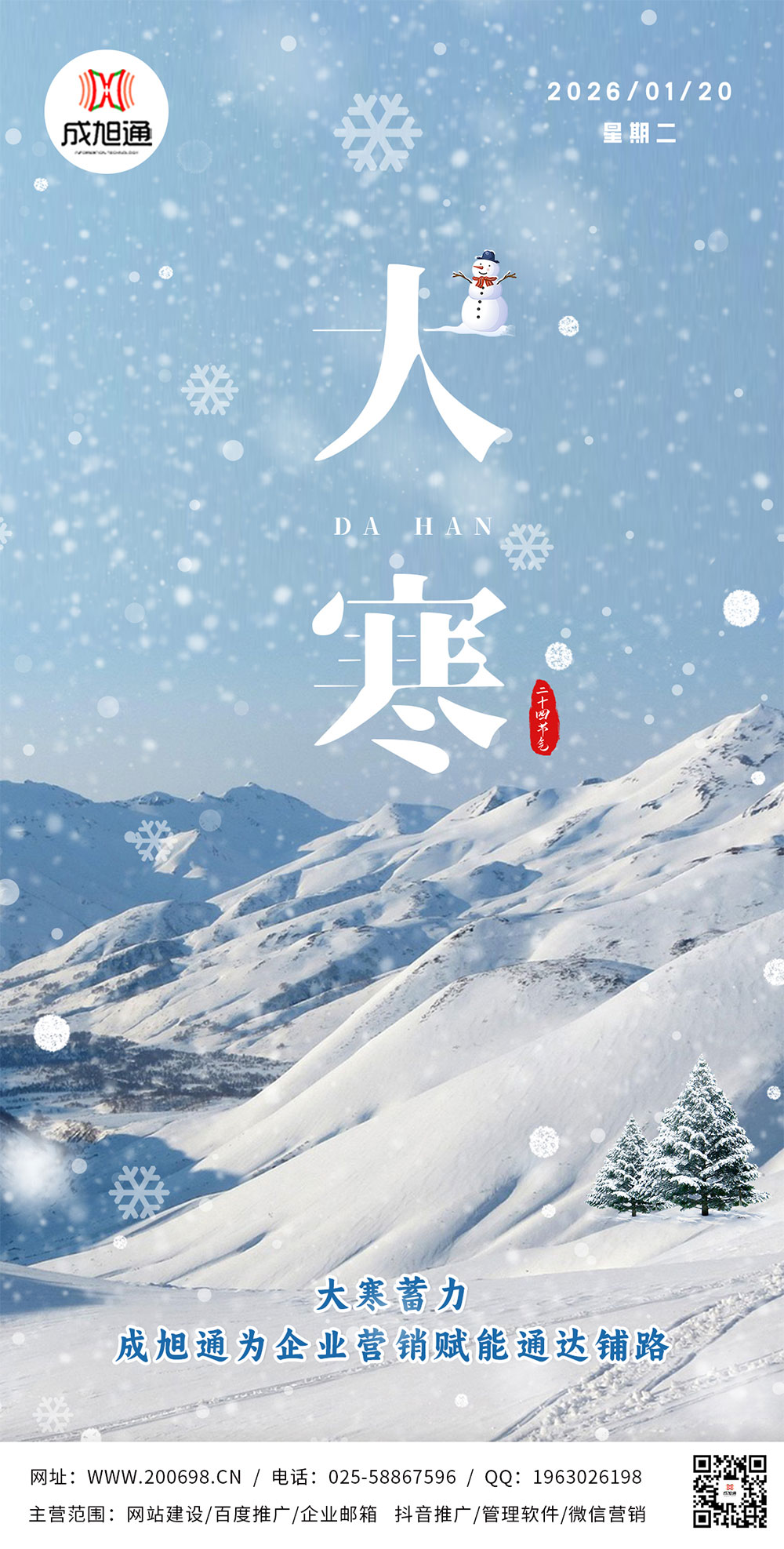 大寒是二十四节气压轴 C 位,冷到极致也藏着回暖生机!民间说 “大寒补对了,一年不受累”,保暖进补、早睡晚起是关键。就像做企业获客,寒冬里更要找对方法!成旭通专业网站设计,帮你打造高颜值获客门面;精准网络营销,让客户主动找上门,淡季也能攒足客源!记住啦:大寒养生养身体,选对营销旺生意!转发这条科普视频,给身边的老板和开公司亲戚朋友提个醒!想通过网络营销获取客户,就找成旭通!我们13年专注网站设计与网络推广!