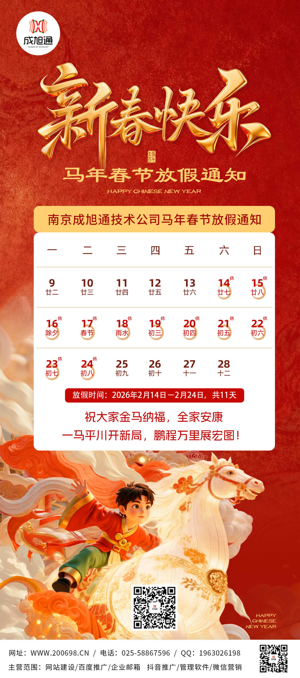 南京成旭通,感恩一路相伴、一路支持!马年将至,成旭通也衷心祝福大家金马纳福,全家安康,一马平川开新局,鹏程万里展宏图!我们成旭通,13年如一日,专注网站设计、网络营销与管理系统,没有花哨的宣传,只有实打实的服务和不变的初心。我们不忘“诚信为本,责任创新,互相共赢,共同发展”的核心价值观,牢记“成就客户,成就员工,成就企业”的使命,始终坚信,只有成就客户,才能成就彼此、共同成长。